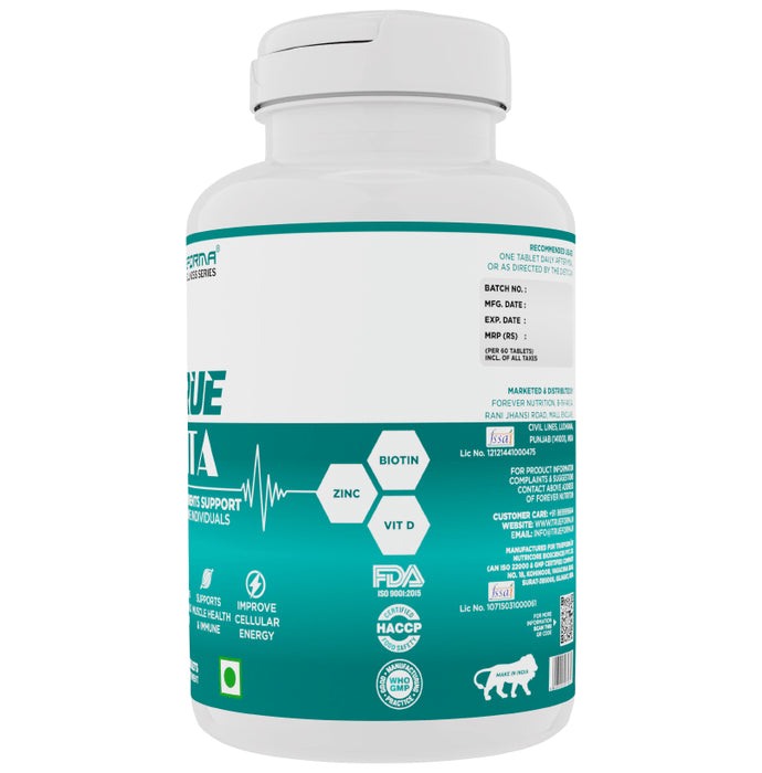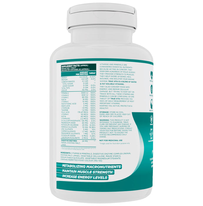 Trueforma True Vita Tablet perform hundreds of roles in the body. This formula provides strength to muscles, helps strengthen the bones, fights wounds, and bolsters the immune system. Trueforma true vita is a blend of water and fat-soluble vitamins, along with added digestive enzymes.