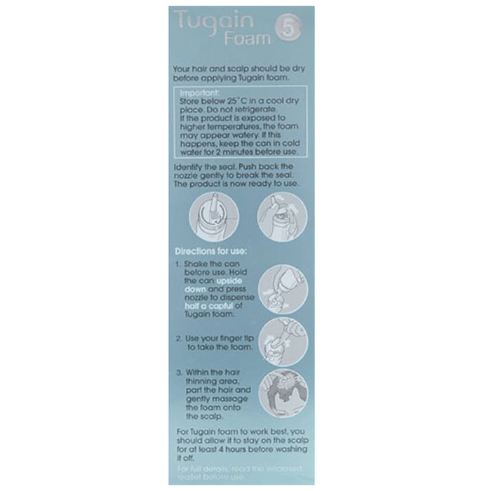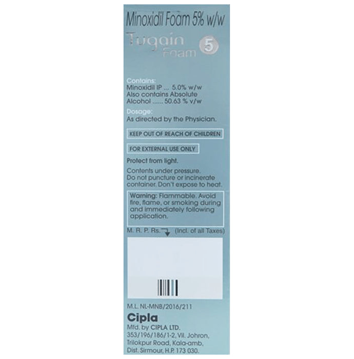 Tugain 5% Foam belongs to a class of drugs known as vasodilators. It is used to promote hair growth in men with male pattern baldness. Tugain 5% Foam should only be applied directly to the scalp area in the amount and in the way specified on the label or by your doctor. Clean and dry your scalp before using it. It may take approximately 2- 4 months before you notice any hair growth. The first growth may be soft, colourless, and barely visible. Using more than recommended will not speed up hair growth and may increase the likelihood of side effects. This medication must be used continuously to maintain hair growth. Tell your doctor if your condition does not improve or worsen after using it for 4 to 6 months.The most common side effects of this medicine include itching, excessive hair growth, rash, and dermatitis. In case of accidental application in other areas, it may result in unwanted hair growth. Rinse thoroughly with plenty of water if you get it in your eyes, mouth, or broken skin. Talk to your doctor if you are bothered by the side effects or if they do not go away.People under 18 or over 65 should not usually use Tugain 5% Foam. It may also not be appropriate if your hair loss is due to medications (such as chemotherapy) or any nutritional deficiency. You should also not use this medicine if you have high blood pressure or use other creams or lotions to treat other scalp conditions. Talk to your doctor if you have heart disease or blood circulation problems.