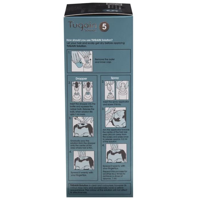 Tugain 5% Solution belongs to a class of drugs known as vasodilators. It is used to promote hair growth in men with male pattern baldness. Tugain 5% Solution should only be applied directly to the scalp area in the amount and in the way specified on the label or by your doctor. Clean and dry your scalp before using it. It may take approximately 2- 4 months before you notice any hair growth. The first growth may be soft, colourless, and barely visible. Using more than recommended will not speed up hair growth and may increase the likelihood of side effects. This medication must be used continuously to maintain hair growth. Tell your doctor if your condition does not improve or worsen after using it for 4 to 6 months.The most common side effects of this medicine include itching, excessive hair growth, rash, and dermatitis. In case of accidental application in other areas, it may result in unwanted hair growth. Rinse thoroughly with plenty of water if you get it in your eyes, mouth, or broken skin. Talk to your doctor if you are bothered by the side effects or if they do not go away.People under 18 or over 65 should not usually use Tugain 5% Solution. It may also not be appropriate if your hair loss is due to medications (such as chemotherapy) or any nutritional deficiency. You should also not use this medicine if you have high blood pressure or use other creams or lotions to treat other scalp conditions. Talk to your doctor if you have heart disease or blood circulation problems.