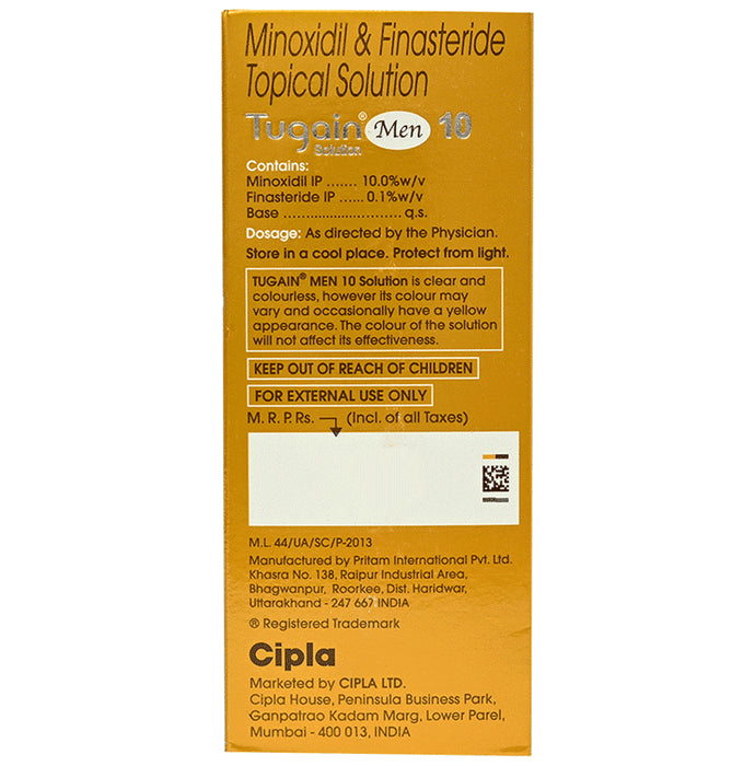 Tugain Men 10% Solution is a combination medicine used in the treatment of hair loss in men. It works by increasing blood flow to the hair follicles which further prevents hair loss and stimulates re-growth resulting in longer, thicker and increased numbers of hair. Use Tugain Men 10% Solution in the dose and duration as prescribed by your doctor or as instructed in the label. Clean and dry your scalp before using it. It may take several months before you notice any hair growth. The first growth could be soft, colorless, and barely visible. Use it in the exact dose and duration as prescribed by your doctor. Using more than recommended will not speed up hair growth and may increase the likelihood of side effects. Use it for as long as the doctor has prescribed to maintain proper hair growth. If your condition does not improve after using it for 4 to 6 months, tell your doctor. This medicine is to be used only by men and not indicated in women.Common side effects of this medicine include application site reactions, dry skin, impotence, decreased libido, ejaculation disorders, breast enlargement, breast tenderness in males, and skin rash. In case of accidental contact with other parts of the body, it may cause excessive hair growth. If you get it in your eyes, mouth, or broken skin, rinse thoroughly with plenty of water. Talk to your doctor if you are bothered by side effects or they do not go away.To ensure its safety, before using this medicine, let your doctor know if you have any problems with your heart. Additionally, inform your doctor about all the medicines you are taking. Pregnant, potentially pregnant, or breastfeeding women should not handle this medicine because of the possibility of absorption of finasteride. As it may cause potential harm to a male baby or fetus.