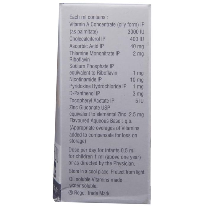 Visyneral Z drops contains Vitamin C Niacinamide Zinc Gluconate equivalent to elemental Zinc D-panthenol, Vitamin B, Vitamin B2 , Vitamin B6, Vitamin A, Vitamin D , Biotin, Vitamin B12 in addition to Energy Carbohydrates and Fat Visyneral Z Drops is used as a nutritional supplement and antioxidant to infants. Also Visyneral Z Syrup is given to preterm very low birth infants in addition to breast milk.Vitamin B-complex when added to the routine feedings of neonatal infants from the onset of feeding helps in appreciable weight gain in infants. Zinc is helpful in the management of diarrhoea. Use under medical supervision.