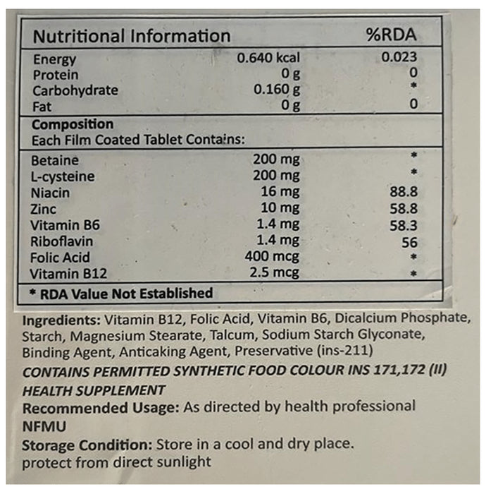Composition : Vitamin B12, Folic Acid, Vitamin B6, Dicalcium Phosphate, Starch, Magnesium Stearate, Talcum, Sodium Starch Glycolate, Binding Agent, Anticaking Agent, Preservative