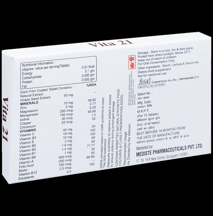Vita 21 Tablet contains the benefits of grape seed extract that help deal with venous insufficiency. This formula helps manage blood circulation and improve blood cell generation. It is also effective in improving the functions of the immune system.