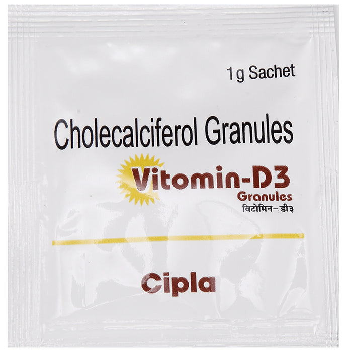 Vitomin-D3 1gm Granules is a vitamin D3 supplement which is primarily used to manage and prevent vitamin D3 deficiency. Vitamin D3 is essential for the growth, formation, and maintenance of healthy bones. Lack of this essential vitamin may cause several bone-related disorders such as osteoporosis, hypoparathyroidism, and rickets. Vitamin D3 is also required for numerous bodily processes, like calcium absorption. It is needed to keep the bones strong and prevents any conditions associated with weak and brittle bones.