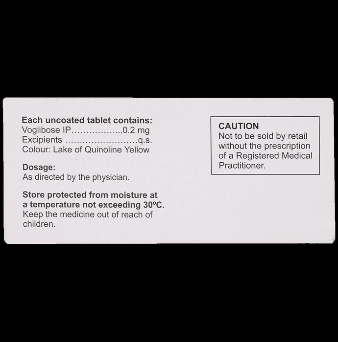 Vogo 0.2 Tablet is a medicine used to treat type 2 diabetes mellitus. It helps control the high blood sugar levels in your body after each meal. It is used when other similar medicines along with a restricted diet, are unable to control abnormally high blood sugar levels.Vogo 0.2 Tablet should be taken just before a meal. The dose and how often you need it will be decided by your doctor so that you get the right amount to control your blood sugar levels. Do not stop taking it suddenly without consulting your doctor. If you do, your blood sugar levels may increase and put you at risk of serious complications like kidney damage and blindness.This medicine is only part of a treatment program that should also include a healthy diet, regular exercise, and weight reduction as advised by your doctor. Monitor your blood sugar levels regularly while taking this medicine.The most common side effects of Vogo 0.2 Tablet include flatulence (gas), stomach pain, loss of appetite, constipation, and diarrhea. Consult your doctor if any of these side effects bother you or do not go away. This medicine by itself does not cause hypoglycemia (low blood sugar levels). However, when used in combination with other diabetes medicines (especially insulin or sulphonylureas), it can lead to hypoglycemia (low blood sugar levels). Such episodes of hypoglycemia will have to be treated by taking plain glucose. Table sugar or common sugar will not help correct low blood sugar levels if you are taking this medicine.Before taking it, let your doctor know if you have any kidney or liver problems. Do not take this medicine if you have ulceration or inflammation in the bowel (eg. ulcerative colitis or Crohn’s disease). Pregnant or breastfeeding women should also consult their doctor before taking it. Please tell your doctor about all the other medicines you are taking to make sure you are safe. Avoid excessive alcohol intake while taking this medicine as it may increase the risk of hypoglycemia (low blood sugar levels).