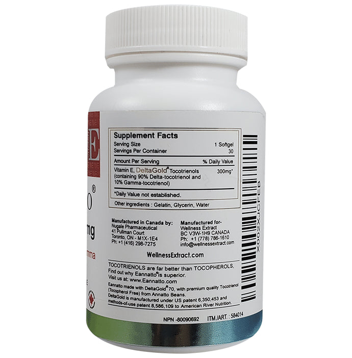 Wellness Extract Vitamin E Delta Gold Eannatto Tocotrienols 300mg Softgel Capsule have anti-inflammatory and therapeutic properties. These capsules support liver, bone, skin and cardiovascular health. This advanced form of vitamin E contains antioxidant properties. Eannatto DeltaGold tocotrienols is a vitamin E supplement that contains 125 - 300 mg of pure tocotrienols (90% delta and 10% gamma tocotrienols), in the form of soft gels. This makes it easier to track your dosage and stay consistent with this unique annatto plant-derived molecule. Our body needs vitamin E as it is an essential micronutrient as well as a powerful antioxidant to live a healthy life. Vitamin E consists of 8 compounds grouped into tocopherols and tocotrienols, each with different chemistries and biological effects. Studies have shown that Tocopherols interfere with the activity of Tocotrienols, so a pure tocotrienol supplement is much more effective for optimal health benefits of vitamin E. Tocotrienols are effective in providing support in multiple health sectors. It is also used as a preventative by many. Supplementing with Eannatto is certainly the best choice to maintain and support the body's needs and experience healthy ageing.
