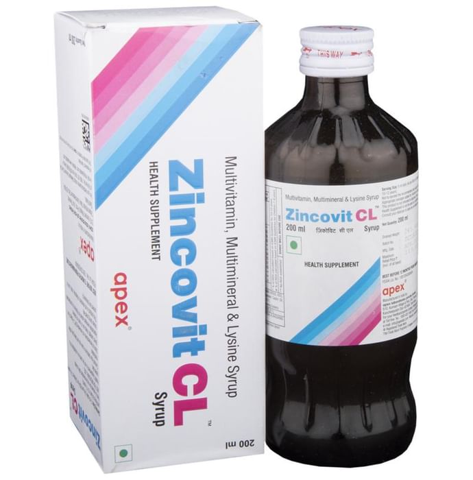 Zincovit CL SyrupZincovit Cl Syrup is a multivitamin, multimineral, and Lysine health supplement that supports the overall functioning of the body. It supplements the needed nutrition to the body and helps improve bone, teeth, hair, and skin health. It aids in the proper functioning of vital body organs and promotes blood formation. Improve your body’s immunity system and enjoy balanced health with this time-tested formulation.